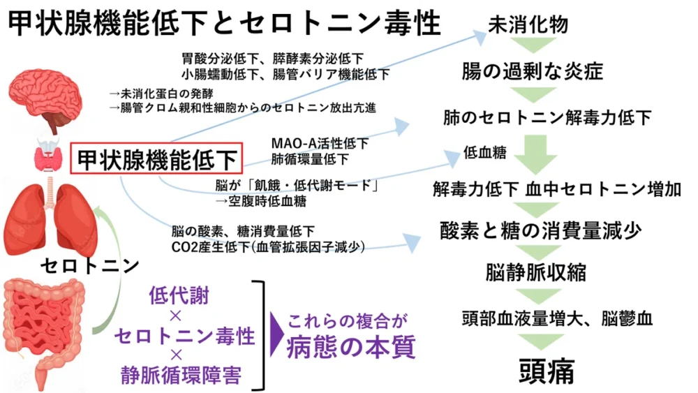 悪循環: 甲状腺が弱る → 腸が動かない → SIBOが悪化する → 栄養がさらに吸収できない。
