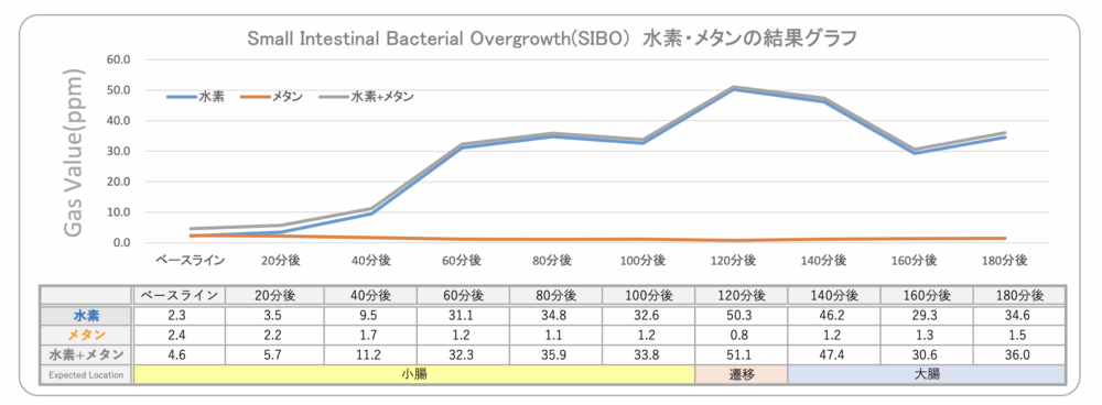 SIBO呼気検査は、小腸で異常に増殖した細菌によって発生するガス(水素やメタン)が呼気に現れる仕組みを利用した検査です。ラクツロースという糖質を摂取後、20分ごとに呼気を採取し、120分以内にガス濃度の上昇が確認されればSIBOの可能性が高いと判断されます。