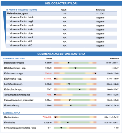 GI-MAPはリアルタイムPCRを利用した総合的な便検査です。糞便の中に含まれる主な細菌量やバランス、病原性のウイルス、原虫、寄生虫などの有無のほか、消化能力、免疫の状態、ゾヌリン(リーキーガットで陽性になるタンパク質)などを調べることができるため、包括的に腸内環境を調べるためには有用な検査です。